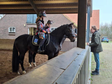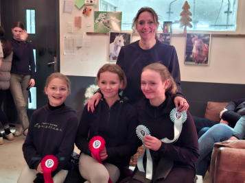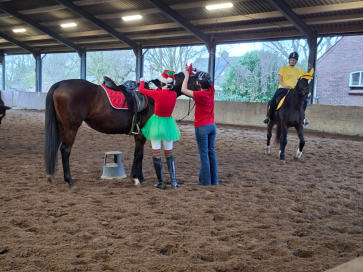 Op zondag 14 december 2025 organiseerden wij voor de eerste keer een Pas de Deux Kerst Editie en wat was dat leuk! Zes combinaties pension-en leaseruiters waren al weken aan het oefenen om samen een mooie proef neer te zetten. Jury Anita en haar man Erik, die sinds jaar en dag regelmatig komen jureren bij ons, waren er ook bij en hebben gelijk de Pas de Deux beoordeeld. Romana met Tout en Karlijn met onze nieuwe aanwinst Filou hebben de eerste prijs gewonnen met hun thema: Cowgirls.Het was gezellig druk en aansluitend was er een gezellige aangeklede kerstborrel voor de deelnemers, pensionklanten, vrijwilligers en collega's. We gaan hier een jaarlijks terugkerende traditie van maken! Het mag gezegd worden dat we een fantastisch team medewerkers, vrijwilligers, pension- en leaseruiters hebben!
